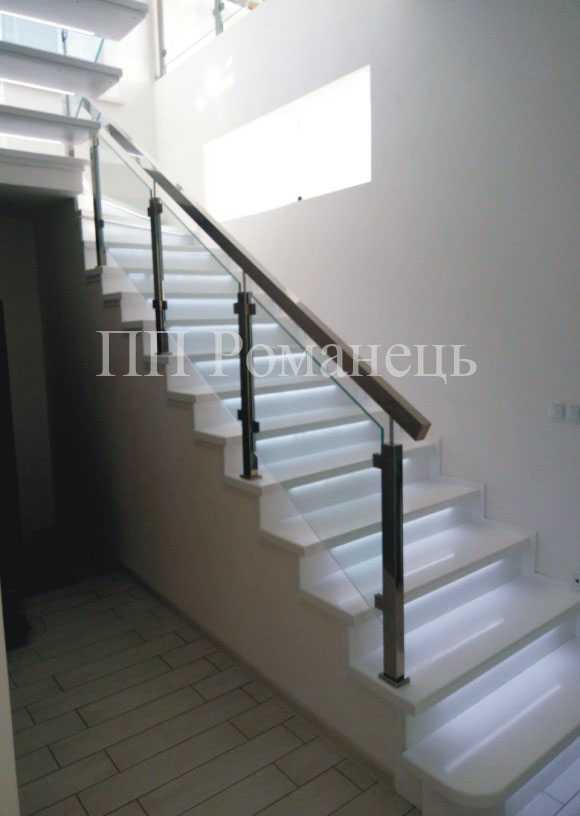 Даний ти перил виготовляється з трьох слоїв армованого скла загальною товщиною 12мм. До сходинок скло кріпиться з боку або на стойки з нержавіючої сталі. За бажанням клієнта скло можна зробити матовим або навести любий малюнок.
